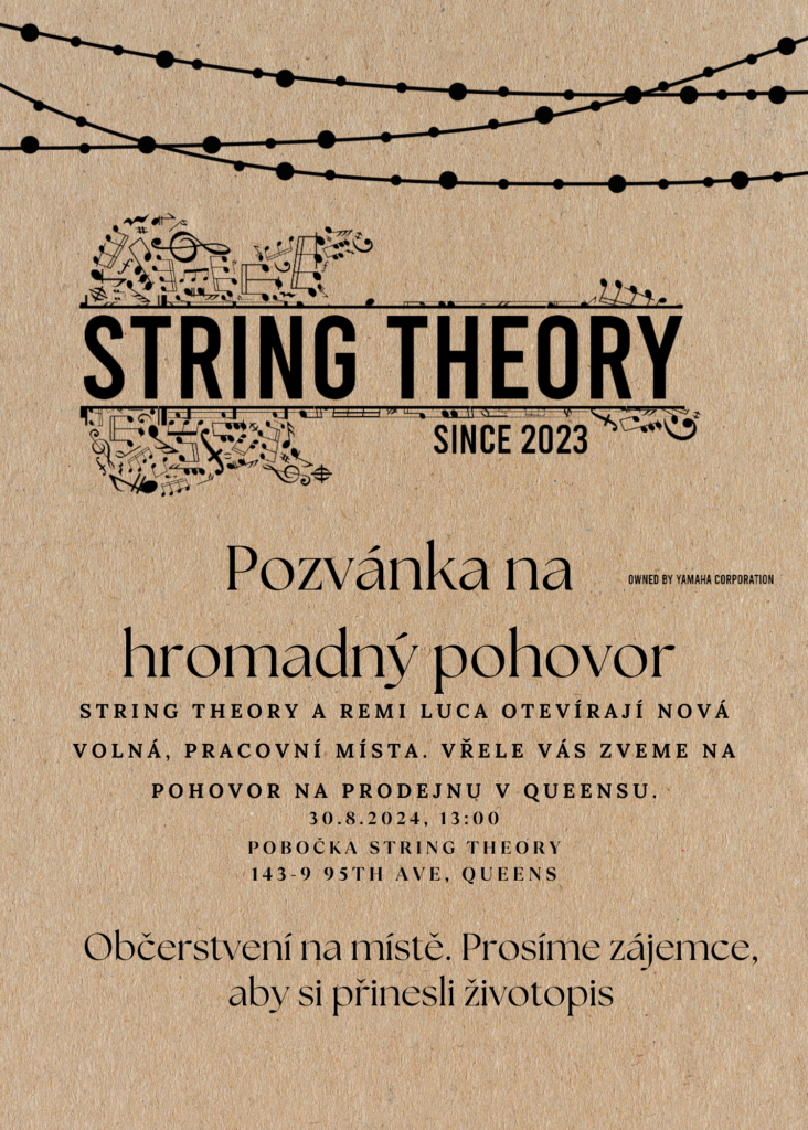 Datum: 30.8.2024 Čas: 13:00 Místo: Queens Cílová skupina: Všichni Remi Luca a zaměstnanci pobočky obchodu String Theory v Queensu Vás srdečně zvou na skupinový přijímací pohovor na hlavní pracovní poměr na pozici- asistenta expedice a prodeje, grafika (tvorba grafiky pro e-shop i kamennou prodejnu), prodejce hudebních nástrojů s praxí v oboru hudebního vzdělání (převážně strunné […]